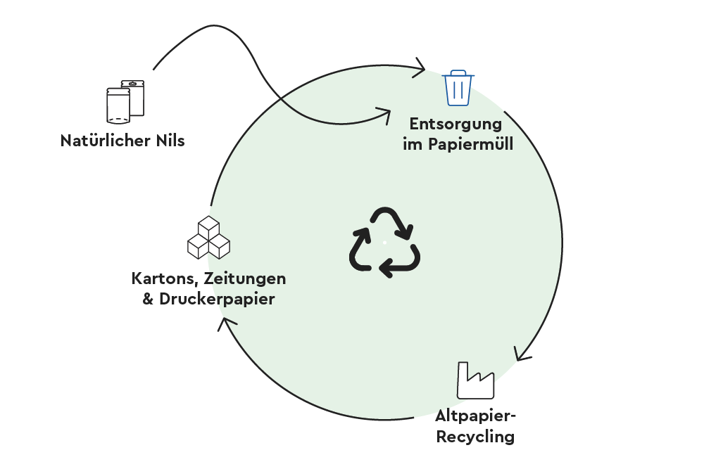 Zum Einen ist unser Nils-Material voll kreislauffähig, das heißt recyclingfähig, da das Material nach dem Gebrauch im Altpapier entsorgt werden kann.