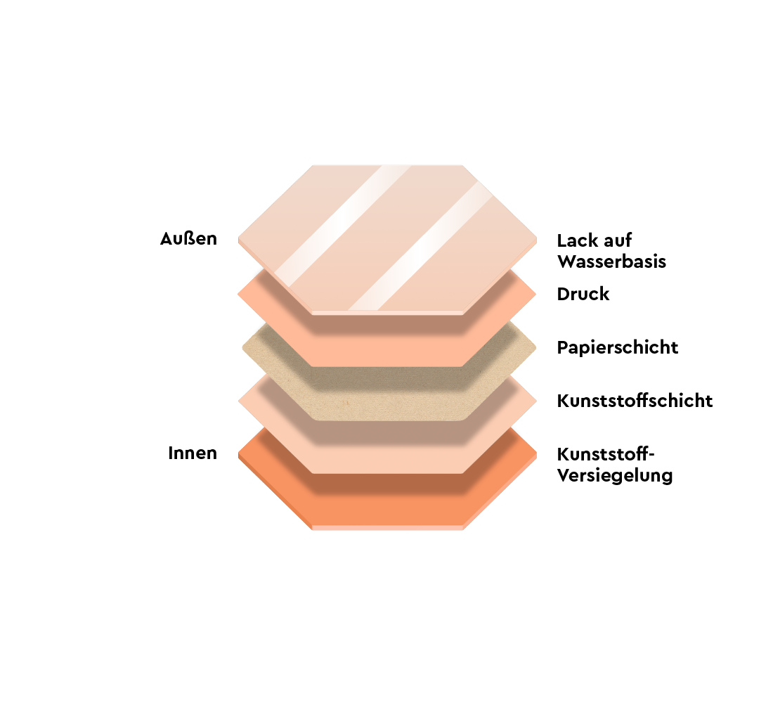 Der wasserbasierte Schutzlack sorgt dafür, dass UV-Strahlung und Sauerstoff keine Chance haben. Der innere transparente Kunststoff-Film wiederum schützt dein Produkt vor Feuchtigkeit. Wie du siehst: Der Aufbau einer guten Verpackung ist hochkomplex - der Schutz deines Produkts ist für uns das Wichtigste.