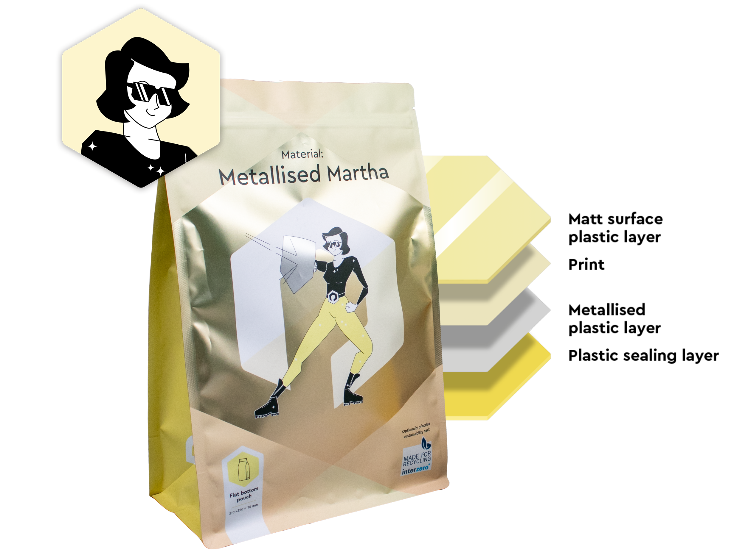 For our wide pouches, we only use our packaging material Metallisierte Martha, which is made of a mono-material and can be recycled in the yellow bin. This is how we make the greatest possible contribution to a functioning circular economy and protect the environment. This is confirmed by the ‘Made for Recycling’ seal from the recycling and environmental expert Interzero.