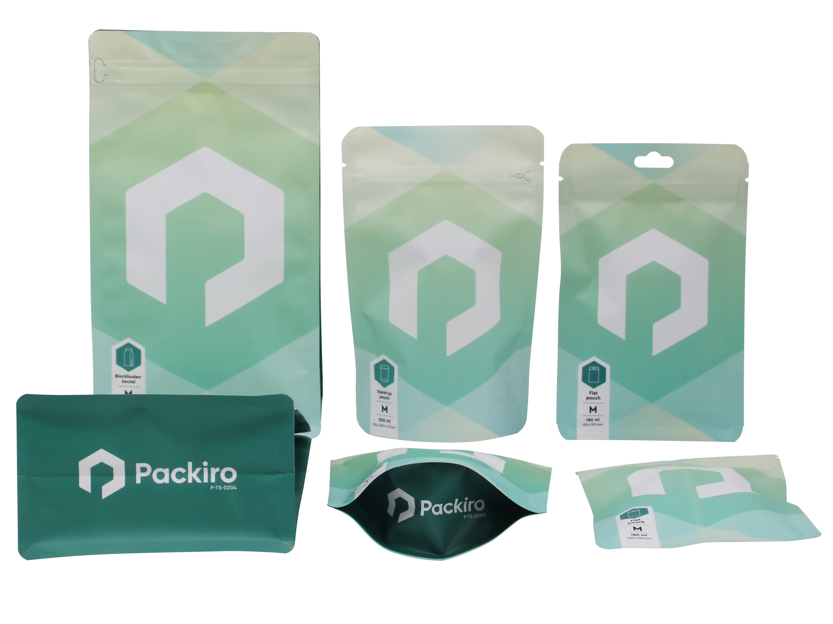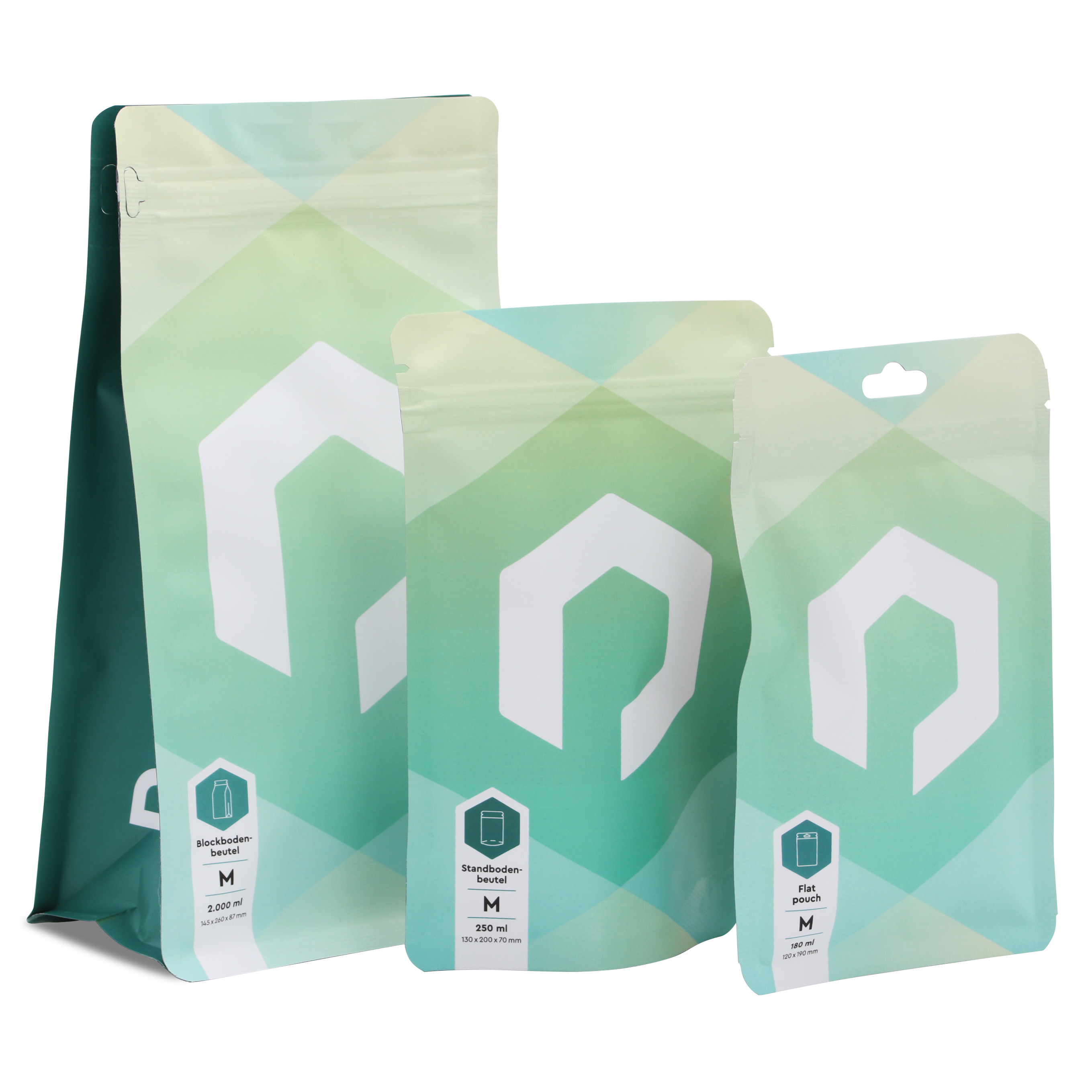 Ces trois formes d'emballage sont des "sachets à fermeture ZIP" qui se ferment de manière fiable à l'aide d'un zip. Alors que les Doypacks sont fonctionnels et polyvalents, les Sachets bloc offrent un maintien particulièrement robuste grâce à leur forme stable. Grâce à leur trou européen optionnel, les sachets plats sont l'emballage parfait pour être accrochés sur le point de vente. Les trois types d'emballage peuvent être personnalisés avec les couleurs de ton choix et des effets spéciaux créatifs : De l'aspect papier kraft à la fenêtre transparente, tout est possible !