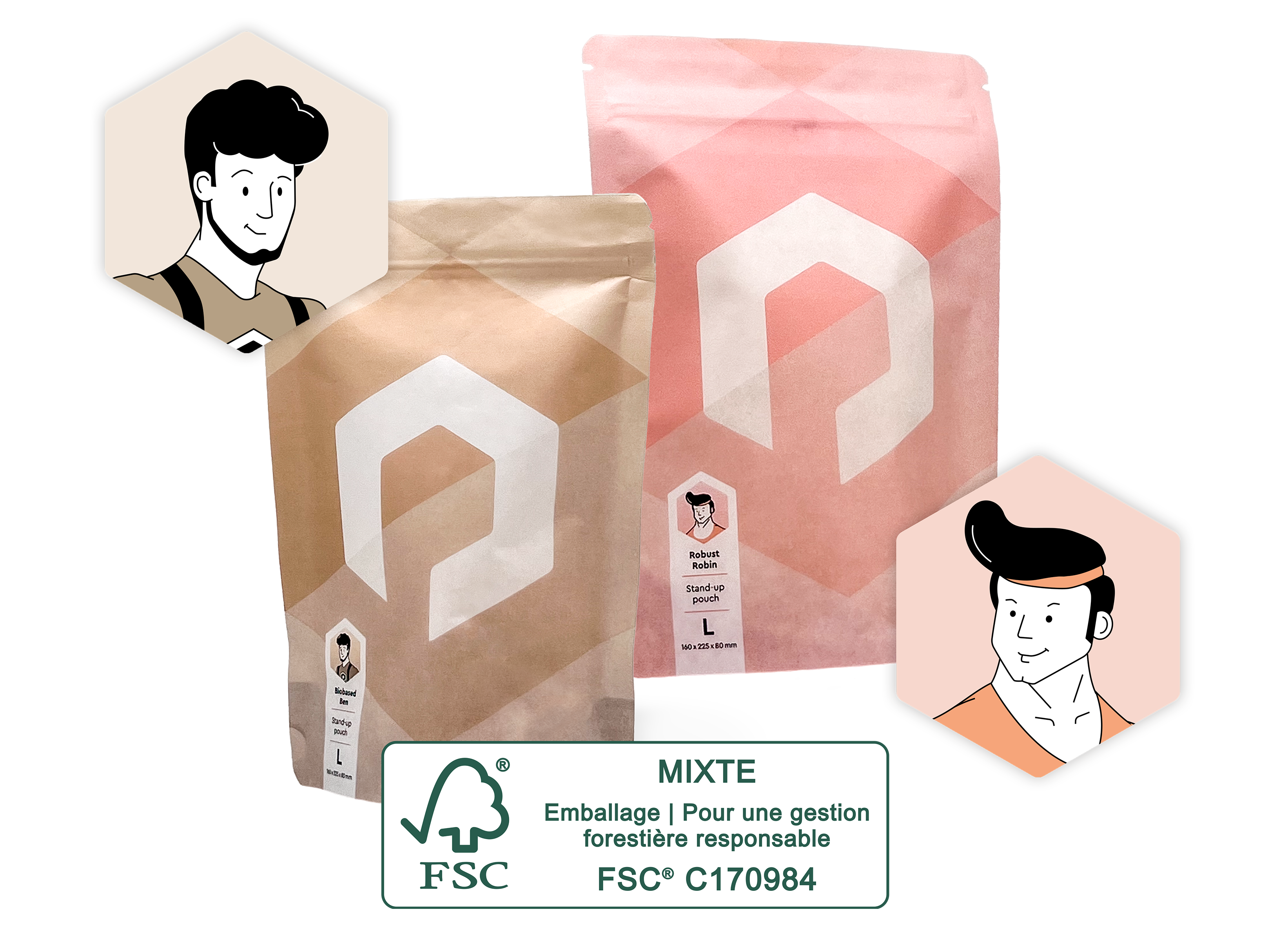 Si tu optes pour les matériaux "Toni transparent" ou "Martha métallisée", tu peux imprimer le label "Made for Recycling" sur tes emballages. Pour Robin, Ben & Nils, le label FSC® est possible. Pour notre emballage biosourcé Ben, tu peux également utiliser le label "OK biobased".