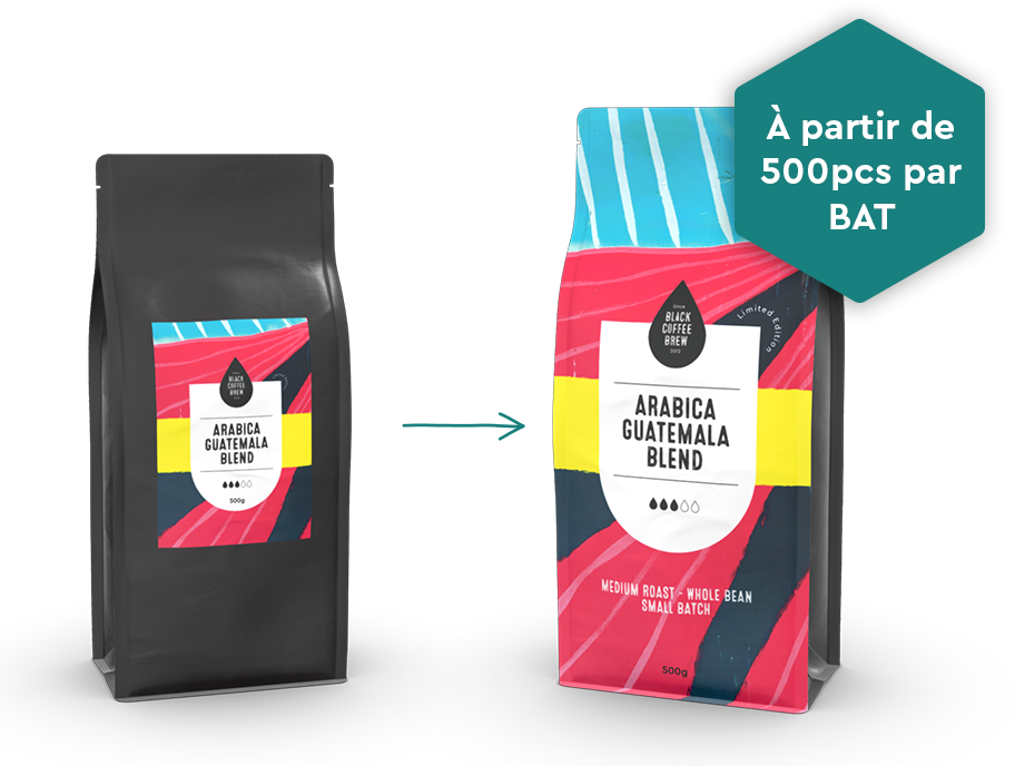 Nous pouvons t’offrir le meilleur des deux façons ! Grâce à une faible quantité minimale de commande à partir de 500 pièces par visuel, tu restes flexible au maximum lors de la commande et tu imprimes quand même tes emballages sur toute la surface dans des designs époustouflants ! Cela te donne une liberté maximale, que tu sois un grand ou un petit torréfacteur.