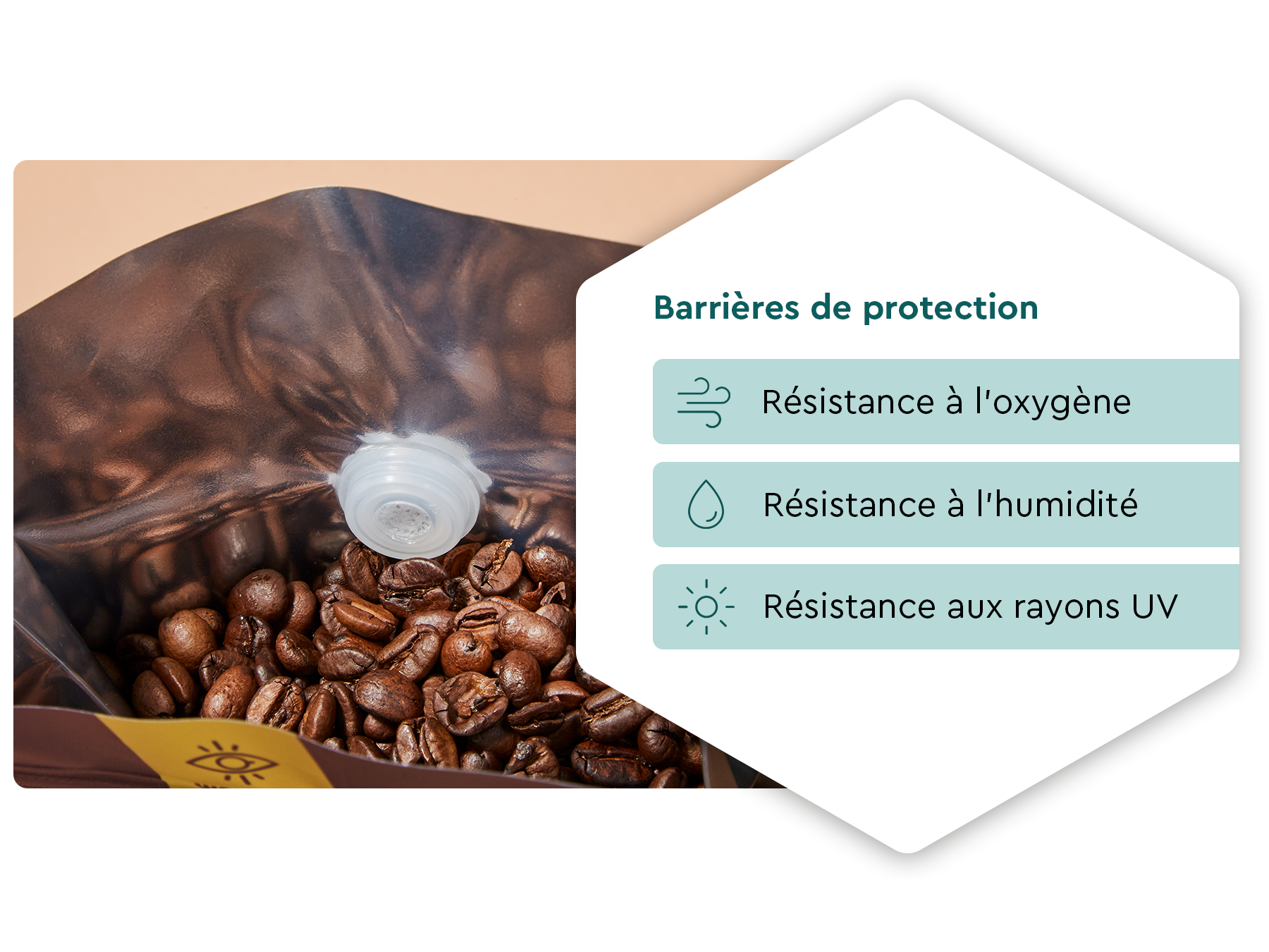 Pendant le processus de torréfaction, des huiles essentielles sont libérées dans les grains de café, ce qui confère au café son goût unique. Pour protéger celui-ci et conserver l'arôme du café, il faut le protéger de l'oxygène, des rayons UV et de l'humidité. Sinon, les grains risquent de s'oxyder, de perdre leur arôme, de rancir ou même de moisir. Pour éviter cela, nos emballages de café sont conçus de manière à garantir des valeurs de barrière maximales et à conserver tes grains frais pendant longtemps.