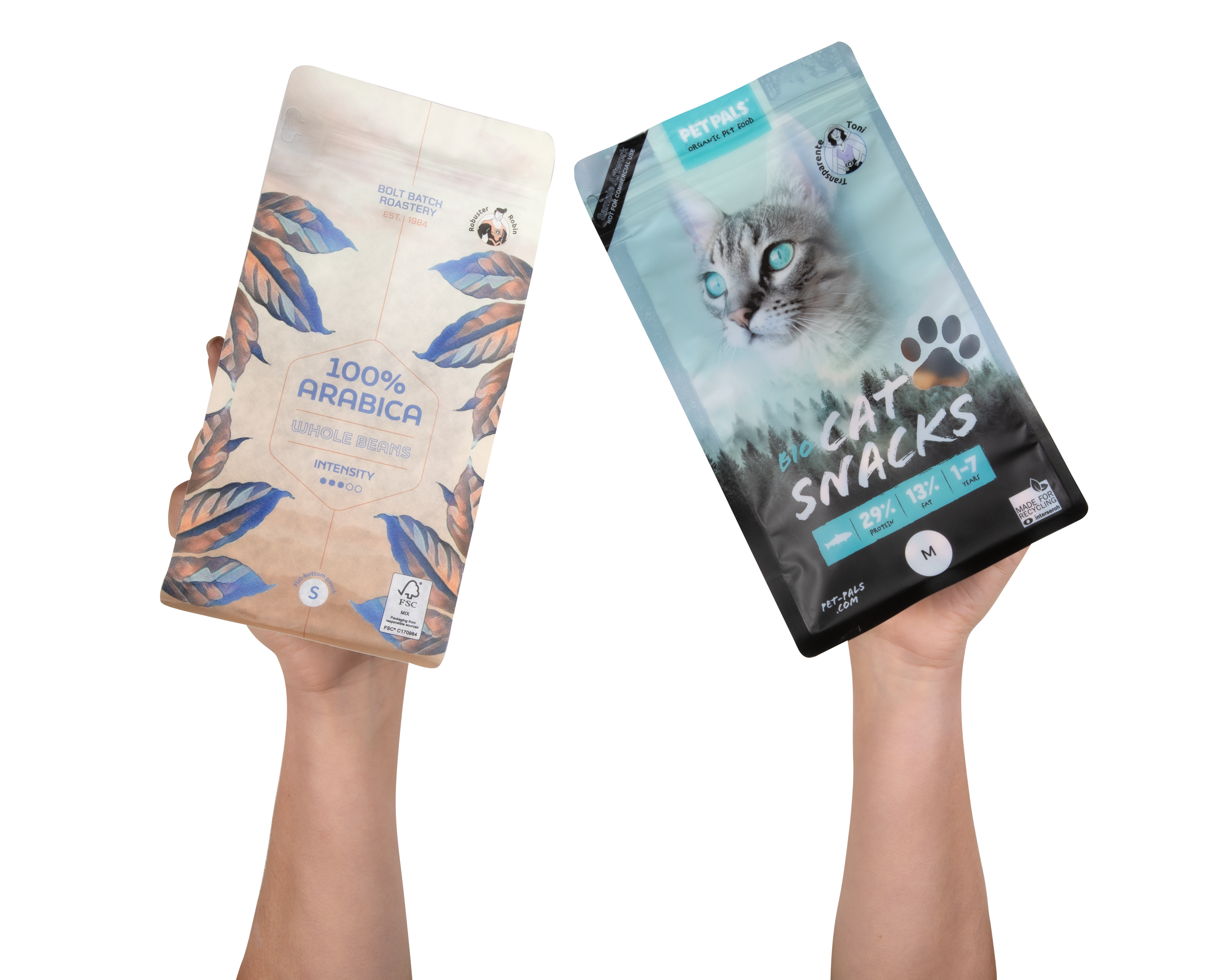 Les sachets à fond plat sont particulièrement qualitatifs en raison de leur forme d'emballage stable et robuste. Grâce à leur valve de dégazage commandable, ils constituent l'emballage idéal pour le café. Avec leurs cinq surfaces imprimables, ils offrent de nombreuses possibilités d'émotion, de storytelling et de persuasion de vos clients.