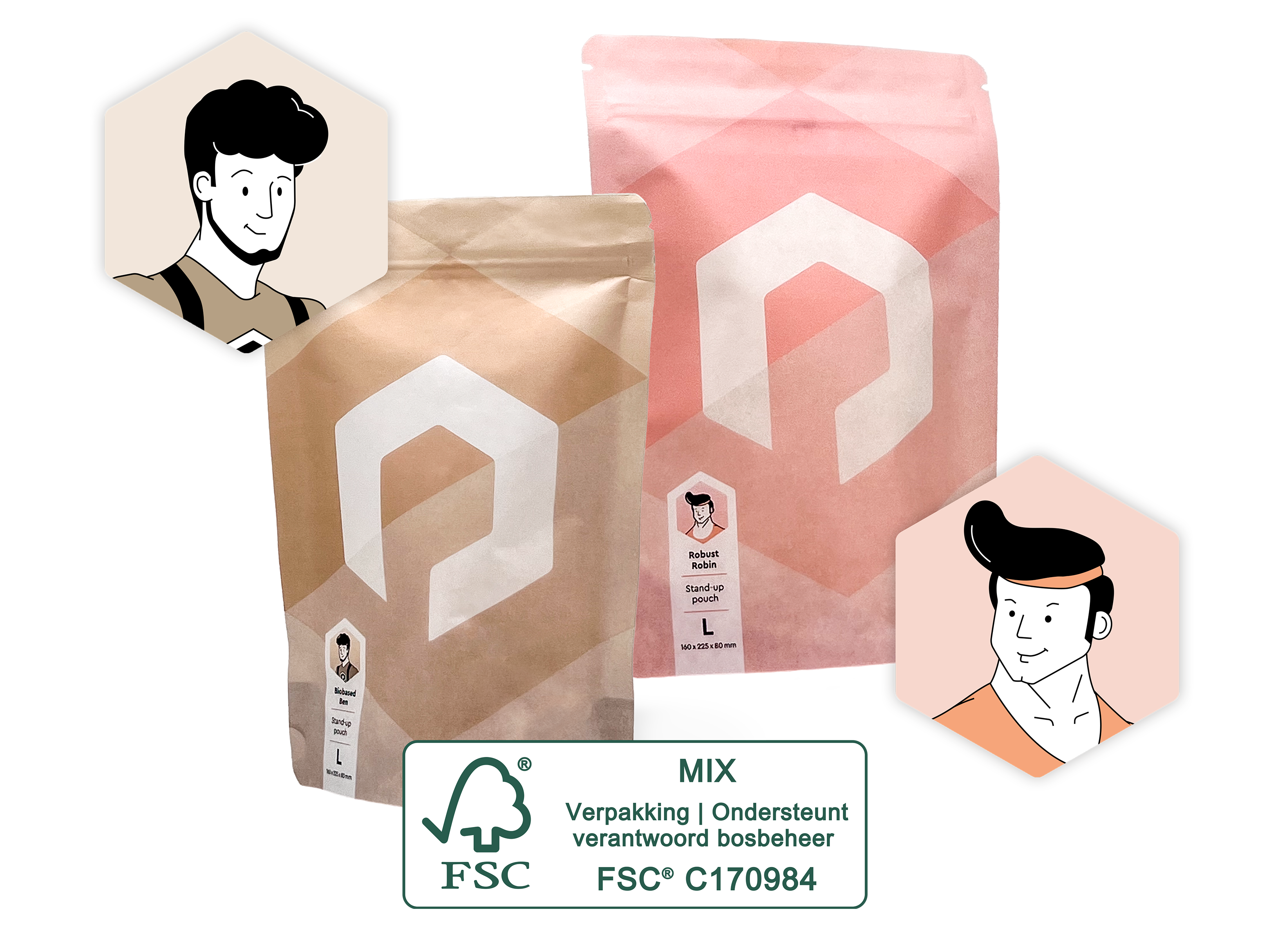 Als je kiest voor de materialen "Transparante Toni" of "Gemetalliseerde Martha", kun je het "Made for Recycling" zegel op je verpakking laten drukken. Voor Robin, Ben & Nils is het FSC® keurmerk mogelijk. Voor onze biobased verpakking Ben kunt u ook kiezen voor de "OK biobased" verzegeling.